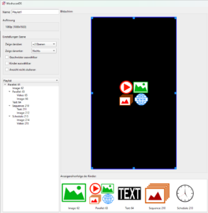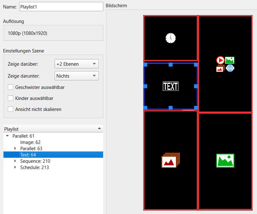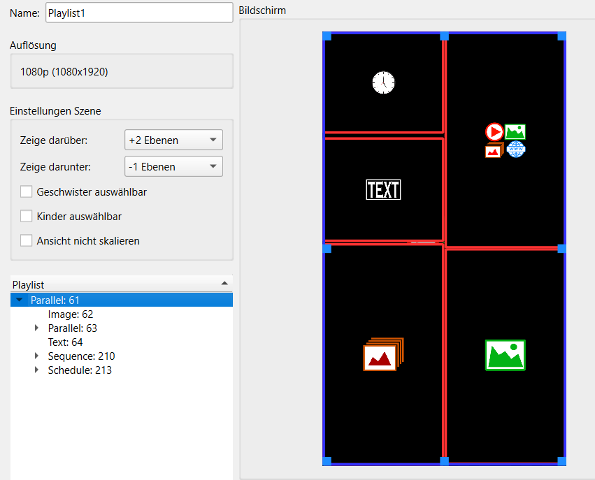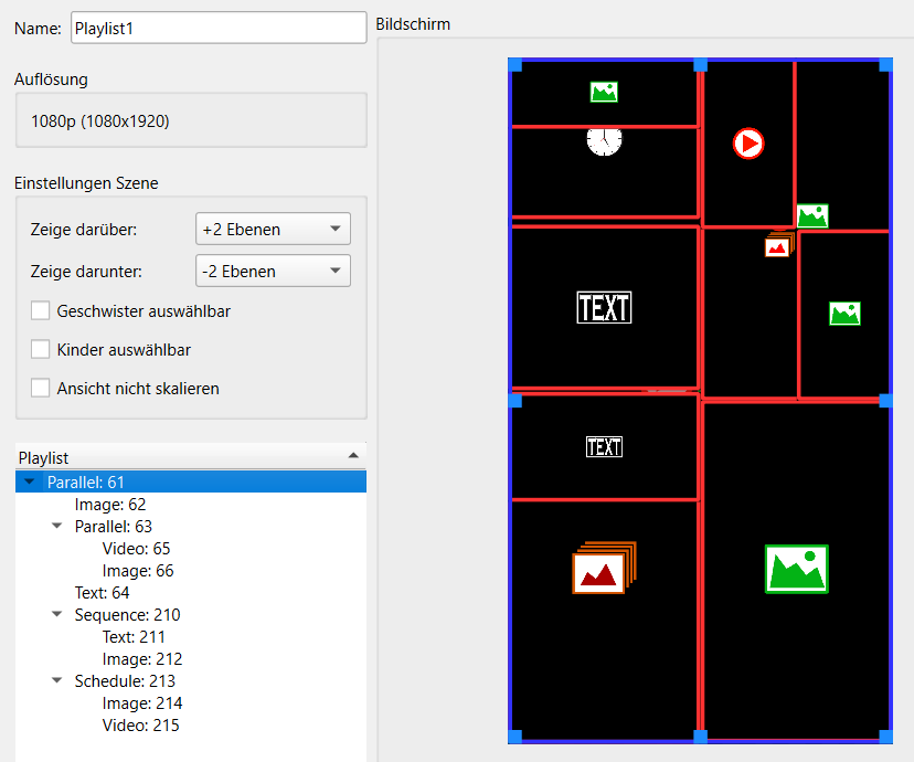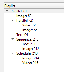 Eine Ebene ergibt sich aus der Tiefe eines Playlist-Items im Baum. Nested-Items wie Parallel-, Sequence- und Schedule-Items bieten die Möglichkeit weitere Items unter ihnen zu verschachteln, das heißt die Tiefe der Ebene eines Items ergibt sich aus der Anzahl an Nested-Items über ihm.