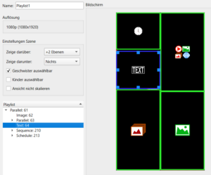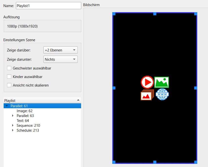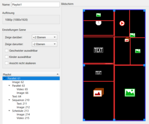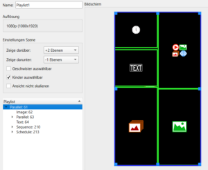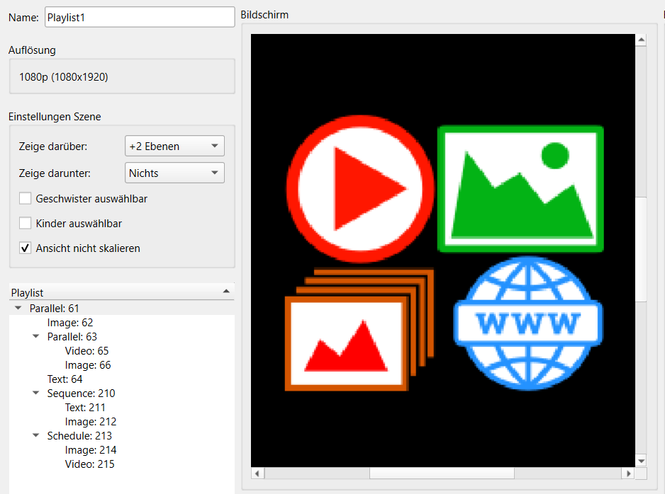 Die Szene dient zur Veranschaulichung der Playlist und der Playlist-Items und bildet die Items so ab, wie sie letztendlich auch auf dem Bildschirm dargestellt werden. Um Items in der Szene darzustellen und zu bearbeiten muss ein Item im Baum ausgewählt werden, auf dem die Szene basieren soll. Mithilfe von verschiedenen Einstellungen kann dann beeinflusst werden, wie viele Items zusätzlich zu dem ausgewählten Item während der Bearbeitung in der Szene sichtbar sein sollen.
