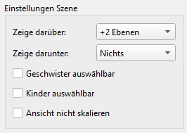 Mit den Standardeinstellungen der Szene ist immer das im Baum ausgewählte Item, plus alle Items in der gleichen Ebene und bis zu zwei Ebenen über dem ausgewählten Item sichtbar. Die Ebenen unter dem ausgewählten Item sind standardmäßig unsichtbar, da die in der Szene eingenommene Fläche eines Nested-Items normalerweise durch seine Kinder komplett eingenommen wird und dadurch das im Baum ausgewählte Item verdecken. Um eine bessere Übersicht über die finale Anordnung aller Items in der Szene zu bekommen können die unteren Ebenen aber auch schrittweise sichtbar gemacht werden. Es ist dabei möglich sowohl die Ebenen über, als auch unter dem ausgewählten Item sichtbar bzw. unsichtbar zu machen.