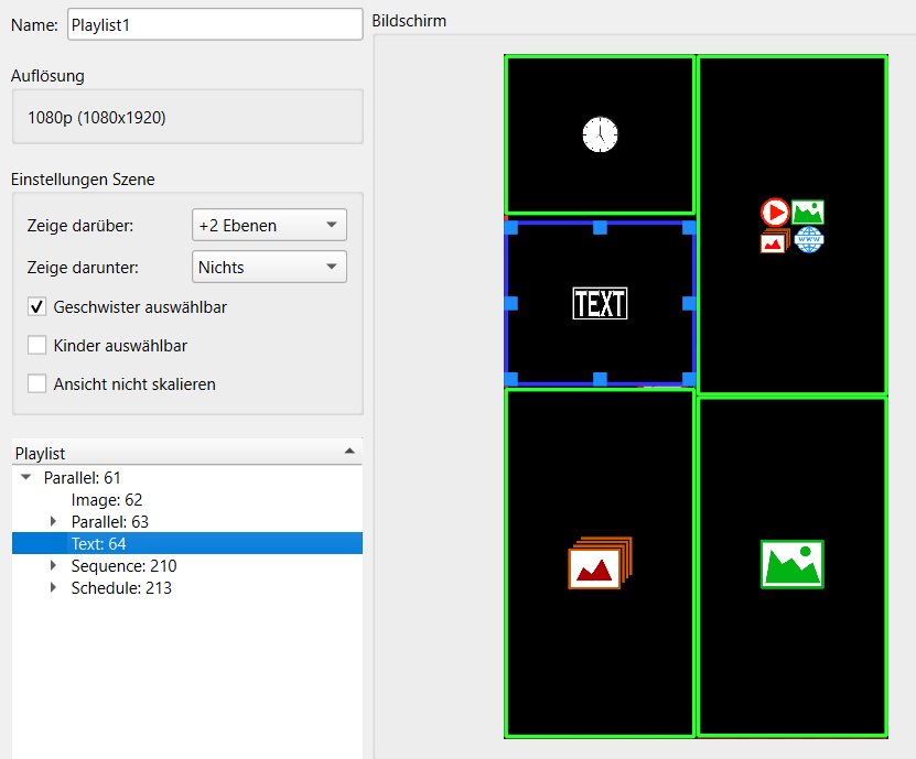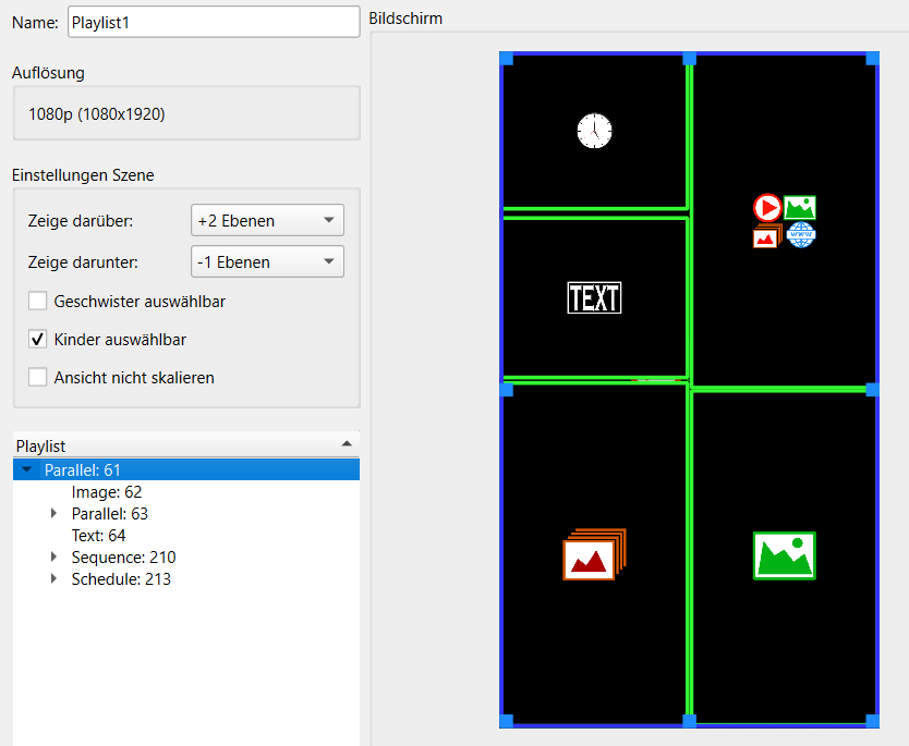 Standardmäßig kann nur das im Baum ausgewählte Item in der Szene ausgewählt und bearbeitet werden. Über die Szeneneinstellungen ist es können die Geschwister und/oder die Kinder eines im Baum ausgewählten Items für die Auswahl und der Bearbeitung freigeschaltet werden. Alle Items, die an ein Nested-Item angehangen sind, werden dessen Kinderitems genannt und Geschwister eines Items besitzen das gleiche Elternitem. Im abgebildeten Beispielbaum ist Parallel 61 das Elternitem von den Kindern Image 62, Parallel 63, Text 64, Sequence 210 und Schedule 213, welche dann Geschwister sind.